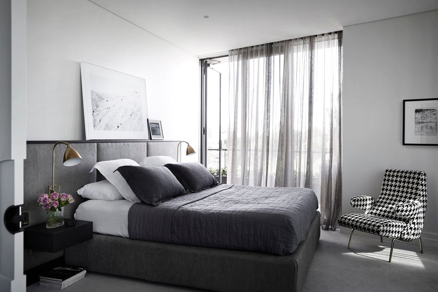Dacă doriți ca dormitorul să pară mai mare, atunci în mod clar trebuie să optați pentru draperii până în podea. Efectul vizual este dat de linia de jos a draperiei, care conduce privirea din podea până în tavan. Dacă această linie se oprește cu câteva degete deasupra podelei, acest efect nu poate fi creat.