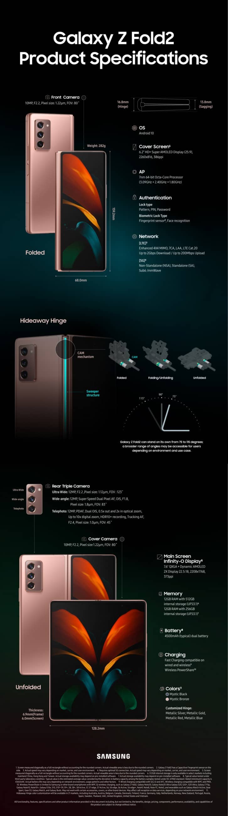 Balamaua a fost reinventata, iar Galaxy Z Fold poate sta deschis de la 75 la 115 grade. Clientii din unele piete isi pot personaliza culoarea exterioara a balamalei. Noul terminal al producatorului sud-coreean este echipat cu 3 camere: una principala de 12 MP cu dual pixel autofocus, a doua camera tot de 12 MP telefoto, iar a treia camera este ultrawide. In partea frontala regasim 2 camere: una de 10 MP care este ascunsa in ecranul exterior si a doua tot de 10 MP amplasata pe ecranul interior din dreapta.